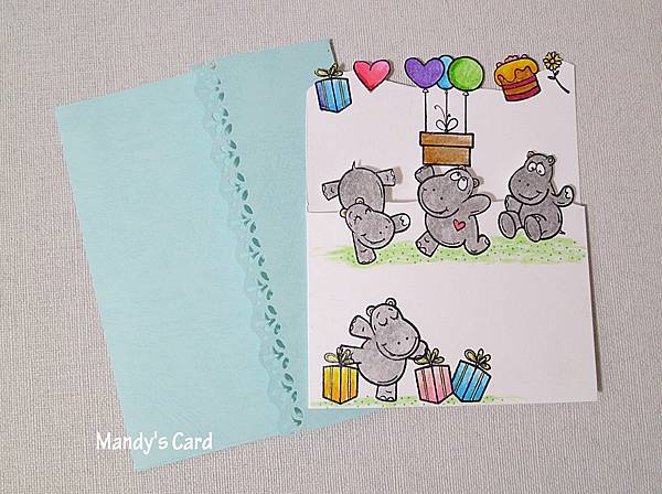 我繼續在卡片的正面,用鉛筆畫一條線,這條線要仔細的量好,因為,當卡片合起來時,二組圖案不要重疊,要儘量有整體構圖的感覺。我在線上蓋了三隻河馬,在卡片的左下角再蓋了第四隻河馬。這些河馬真是越蓋越可愛!這樣子的卡片,也可以不要做的這麼辛苦,你可以將上好色的元素,剪下,再貼回卡片上,但是這樣就不酷了,因為我要做的是整體一張的不規則卡,所以要剪開他們,而不是用貼上的方式。差不多剪好了,也沒什麼難的呀!我用Zig水彩筆,將圖案簡單上色;這是卡片的內頁;這是卡片的外頁;這是卡片的側面;卡片的正面;最後配上一個漂亮的淺藍色信封,生日卡就可以寄出了喔!最近,我看老外玩彩印,都是玩的超開心的,她們完全不計較作品的最後結果,真是一種輕鬆的玩法,也真是完全當成嗜好在享受!