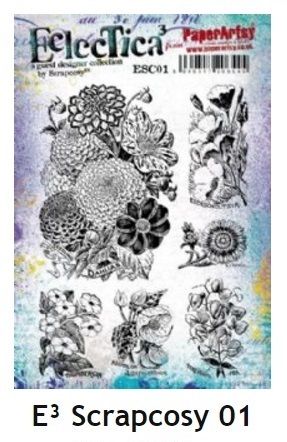 今天玩P家的ESC01花朵印章組。這個印章裡面全是花朵,西班牙的女設計師說這些花都是西班牙古書裡面找到的,取得授權後,讓這些美麗的花朵變成印章,再度呈現在大家面前。我從我的廢紙籃裡面,挑了幾張玩復古色粉時做的背景卡紙,開始動手…